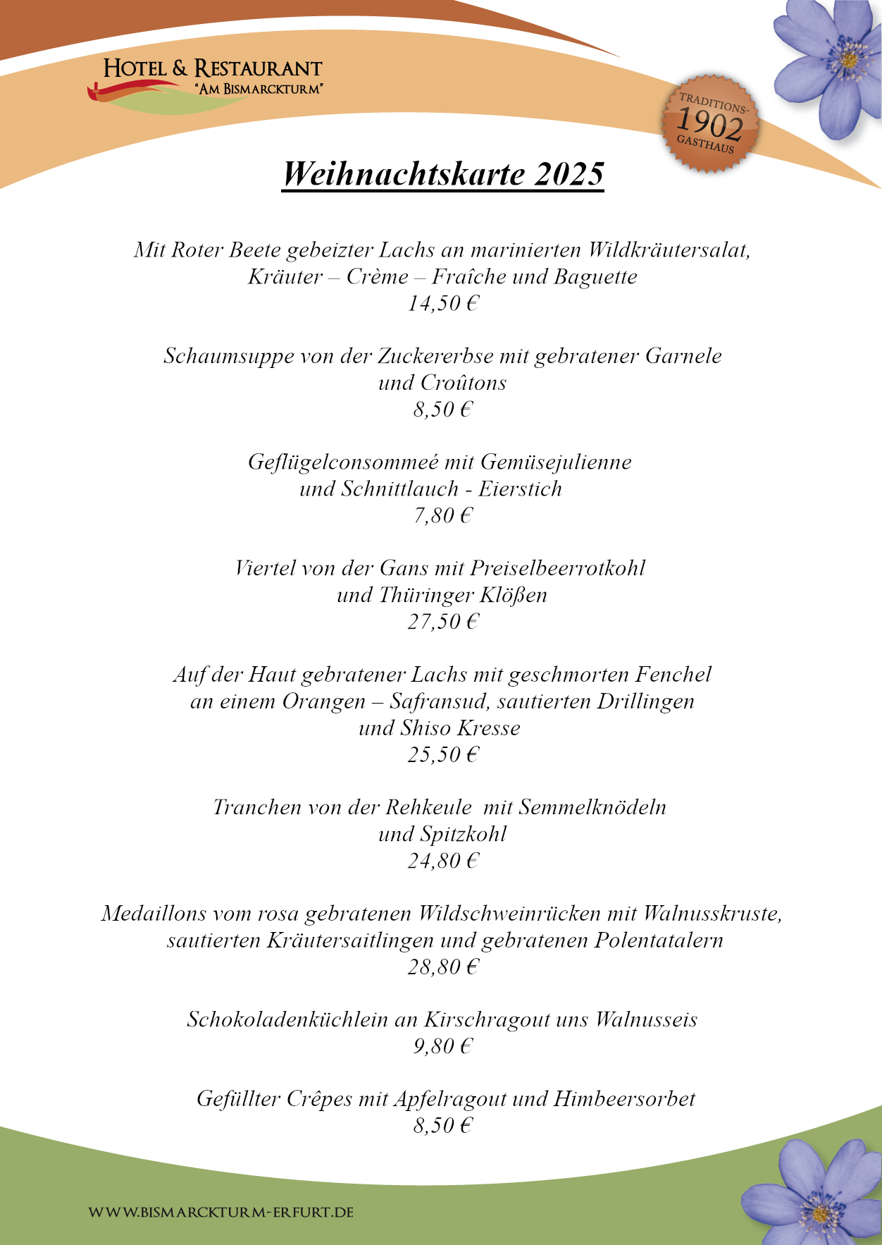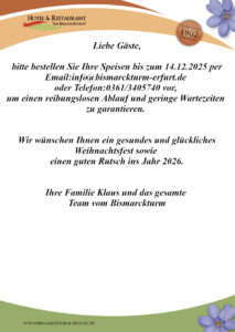 das Jahr neigt sich dem Ende und Weihnachten steht vor der Tür. Auch dieses Jahr bieten wir Ihnen für den 25. und 26.12.2025 wieder verschiedene leckere und schmackhafte Weihnachtsgerichte an.